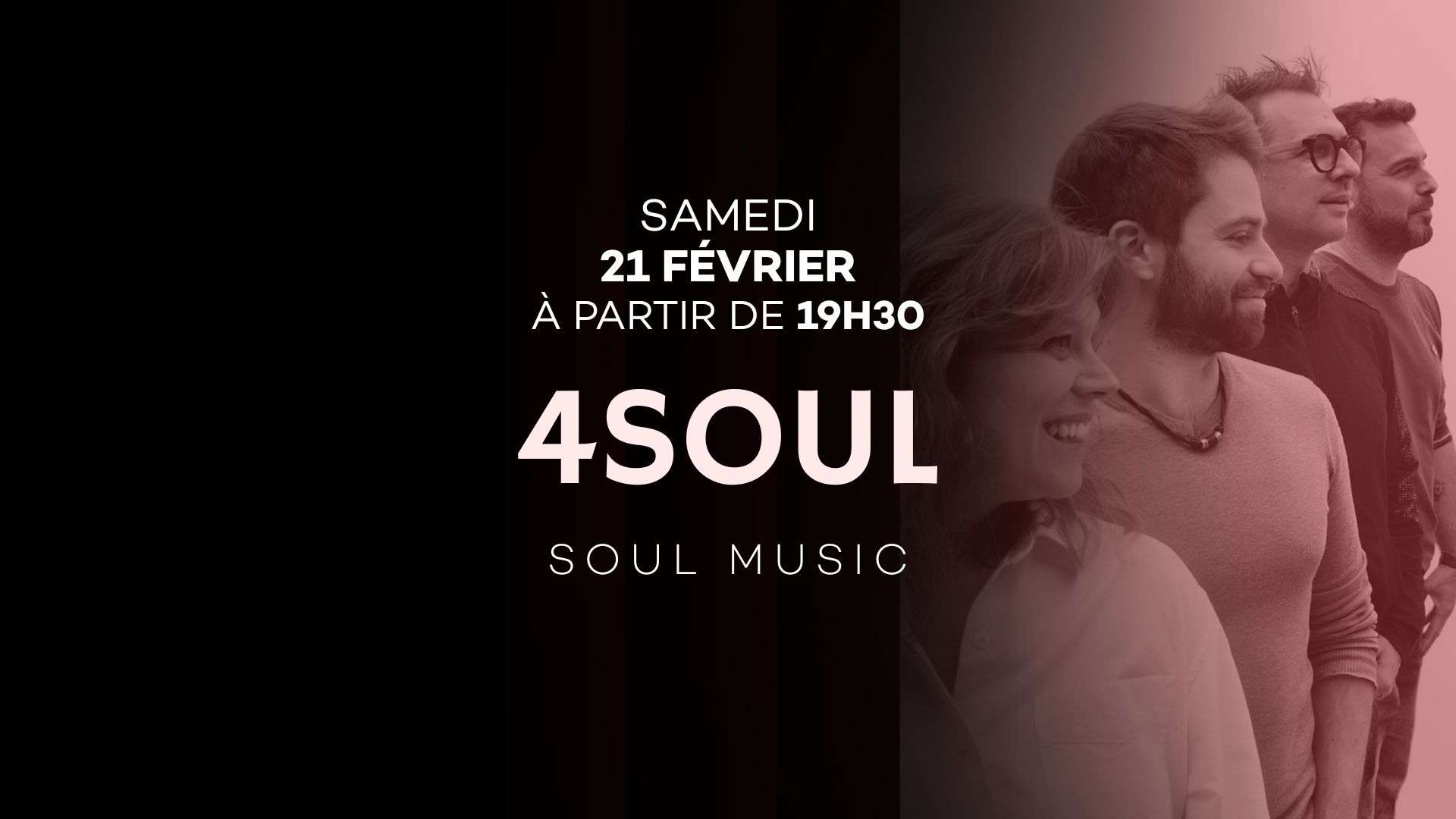 Le Samedi 21 février, venez vivre une parenthèse musicale chaleureuse, raffinée et pleine d’énergie avec 4Soul, un groupe de 4 musiciens passionnés et complices qui mêle avec élégance soul, funk et rock.